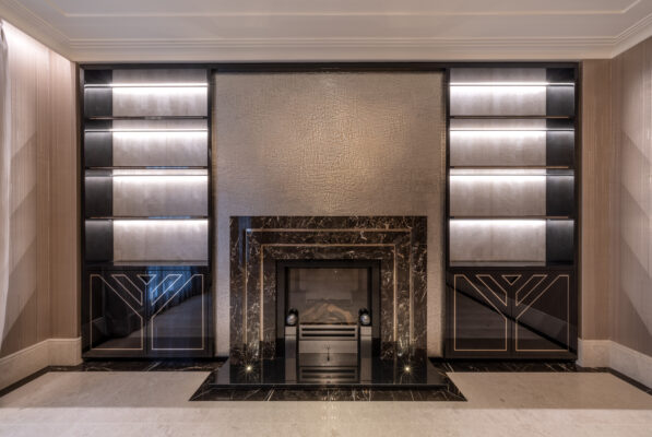 – 1st Floor formal reception feature wall joinery with marble fireplace – Shagreen Flouted