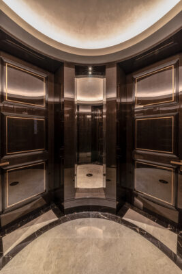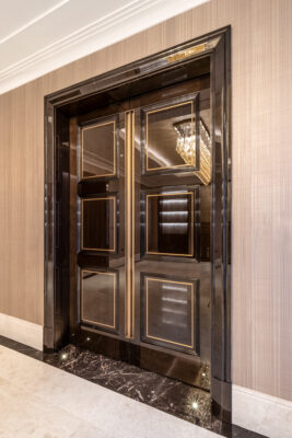 – 65 Fire rate doors and door systems, made with bespoke custom veneer made specifically for the project and finished in high-gloss polyester lacquer