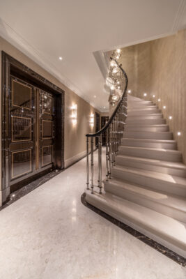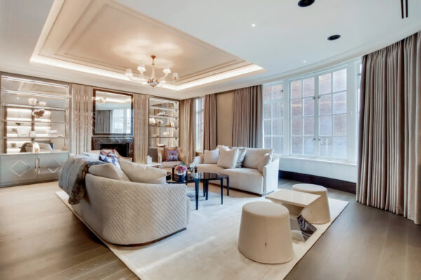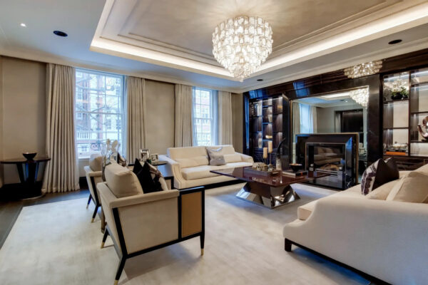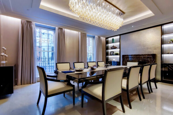 Establishing a stunning, modern take on “deco,” Hill House Interiors 40 South St project embodies the opulence of the 1930s. An open plan living area boasts a huge kitchen-dining space, perfect for entertaining. There is an evident appreciation of luxurious materials and couture furniture, and this can be found in the gorgeous fur throws, that are contrasted with the polished, sleek furniture and grand piano. Also, the attention to detail and tailoring can be seen in the pleated velvet from Zinc used for the bespoke upholstering of the dining chairs.