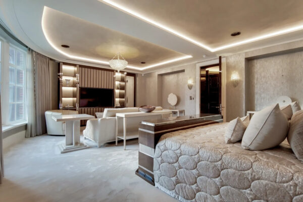 – Master bedroom headboard & pop-up TV unit with feature wall cabinetry opposite